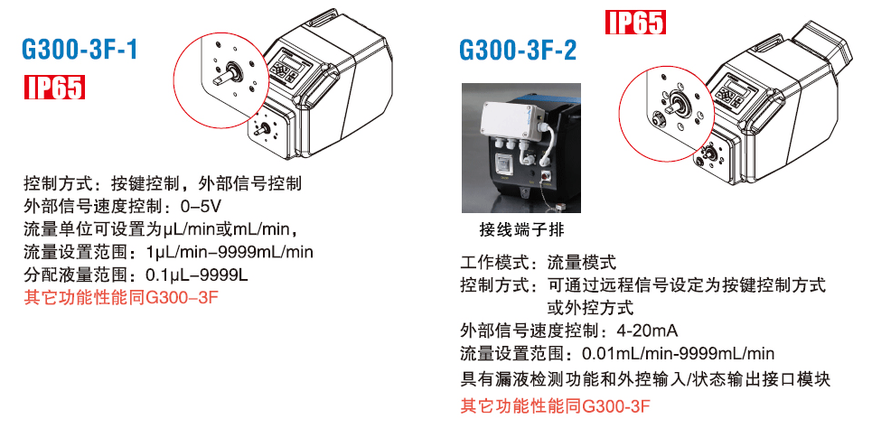 蘭格公司根據(jù)客戶的具體需求,提供定制化的工業(yè)蠕動泵解決方案。G300-3F-1和G300-3F-2都是以G300-3F為基礎(chǔ)的定制化產(chǎn)品,可以配合使用市場上常用的工業(yè)蠕動泵泵頭,并根據(jù)需要更改工作模式、外控功能、增加泵頭漏液檢測功能等。