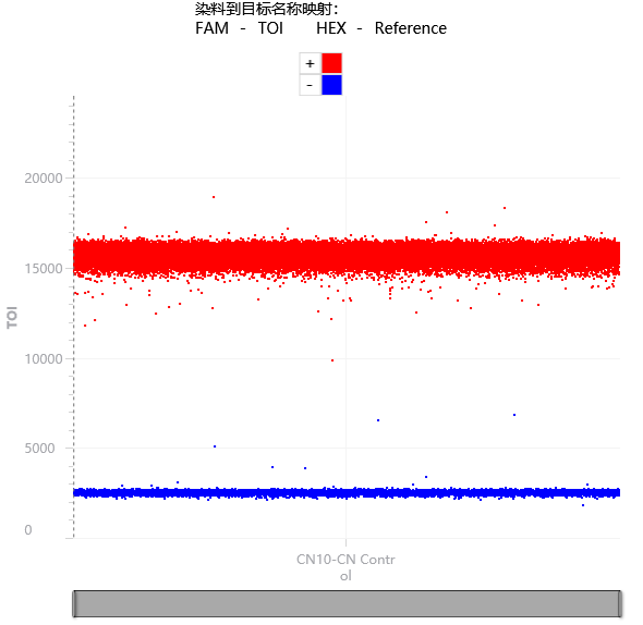 1D,2D結(jié)果中閾值的判讀也是影響最終結(jié)果的重要因素。由于試劑耗材組分、非特異性擴增、探針引物二聚體等現(xiàn)象,導(dǎo)致背景噪音更為明顯,導(dǎo)致陰陽性孔間閾值難以劃分(如圖10)。優(yōu)化探針引物序列和配比、摸索合適的退火溫度、配合低背景芯片耗材(如圖11),同時結(jié)合硬件,比如結(jié)合使用高分辨率的光學(xué)檢測系統(tǒng)、高性能的PCR溫控系統(tǒng)可以有效提高信噪比,使閾值能夠準確劃分。