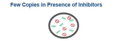 基于泊松分布將核酸樣本分散到大量微孔或者液滴中(如圖1),相較于qPCR而言,dPCR無需標準曲線(如圖2),抑制成分被有效稀釋(如圖3),讀取結(jié)果方式具備更精確結(jié)果的潛力。盡管有諸多優(yōu)勢,我們?nèi)孕柚匾昫PCR的操作過程、試劑耗材穩(wěn)定性及硬件性能帶來的影響;同時需針對性的完善實驗細節(jié),從而盡可能減少引入的偏差,獲得高靈敏度、高穩(wěn)定性的實驗結(jié)果。