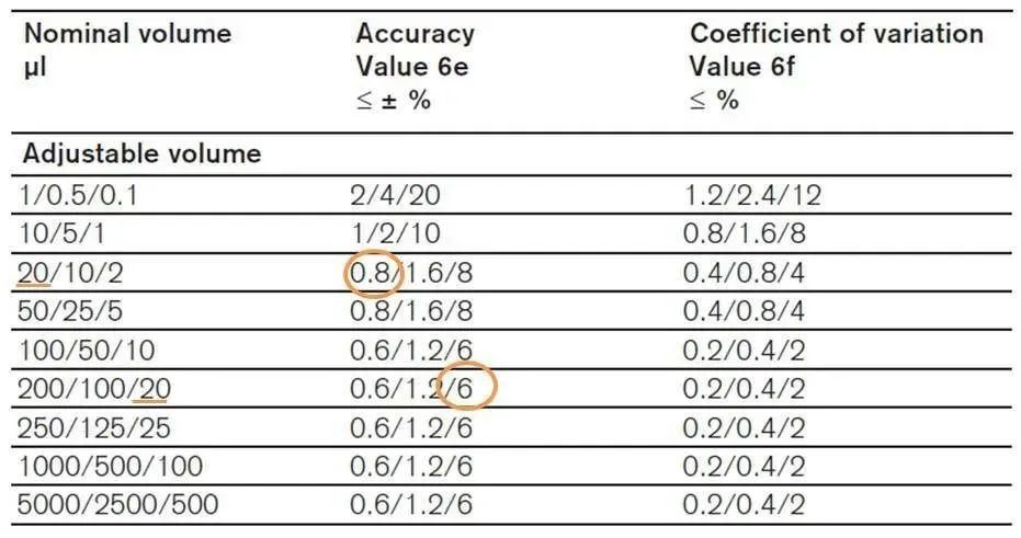 移液操作通常為反向移液,對于低濃度樣本盡可能增加重復(fù)以防止低分子隨機性因素導(dǎo)致結(jié)果不穩(wěn)定,高濃度探針引物稀釋后移液可以減少批間誤差。以手動單道移液器為例(如圖5),同樣是移取20 μl液體,選擇量程是20 μl的移液器時精度≤±0.8%,換算成體積為±0.16μl;而選擇量程是200μ的移液器時精度為≤±6%,體積偏差在±1.2μl 。