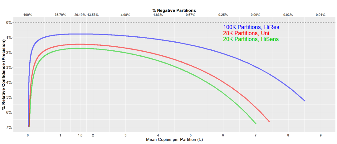 分散過程中的誤差分析:統(tǒng)計學(xué)樣本濃度均值λ,即平均一個分區(qū)單元包含λ個拷貝不一定剛好是真實模板濃度,需要結(jié)合置信區(qū)間和置信水平表示,數(shù)字PCR中置信水平通常是95%,而針對置信區(qū)間科研和商業(yè)化公司有多種計算方式。