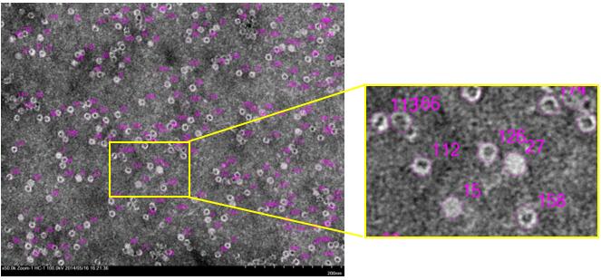 透射電子顯微鏡(TEM)是觀察病毒形態(tài)的最佳工具。日立透射電鏡HT7800有高反差和高分辨兩種模式,能同時(shí)兼顧生物組織的大視野觀察和病毒的高分辨觀察。其 Specimen Search (自動(dòng)顆粒搜索功能)可以自動(dòng)尋找病毒顆粒,并進(jìn)行記錄統(tǒng)計(jì)。